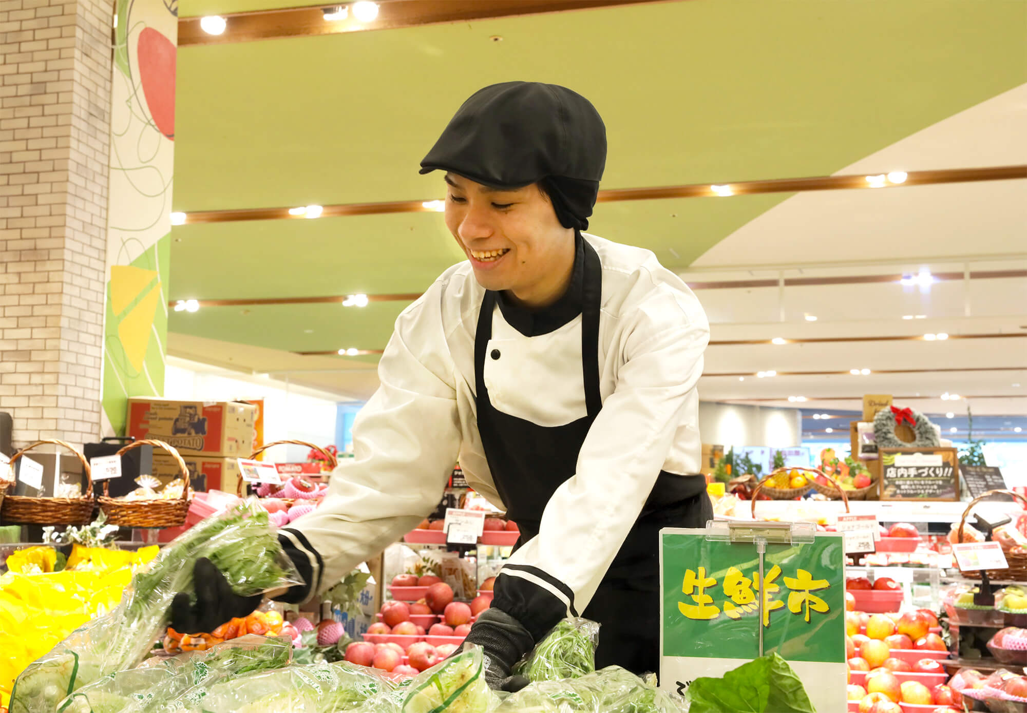 穂田:仕事は楽しいですし、周りの人に恵まれているなと感じています。僕は青果売場で品出しや売場づくりをしているのですが、季節ごとにいろんな野菜や果物が入荷し売場の雰囲気がガラッと変わるので、どうすればお客様の視線を引き、足を止めていただけるかを考えながらレイアウトを工夫する時間が好きです。発注業務も本格的に任せていただけるようになり、少しづつ販売数量を予測する力が身についてきました。自分の工夫が売場に反映されることに、やりがいと楽しさをかんじています。
